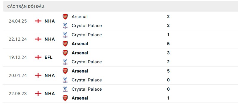 Thành tích khi hai đội chạm trán Arsenal vs Crystal Palace
