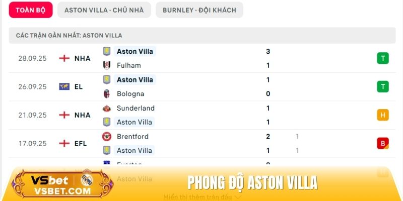 Phong độ Aston Villa