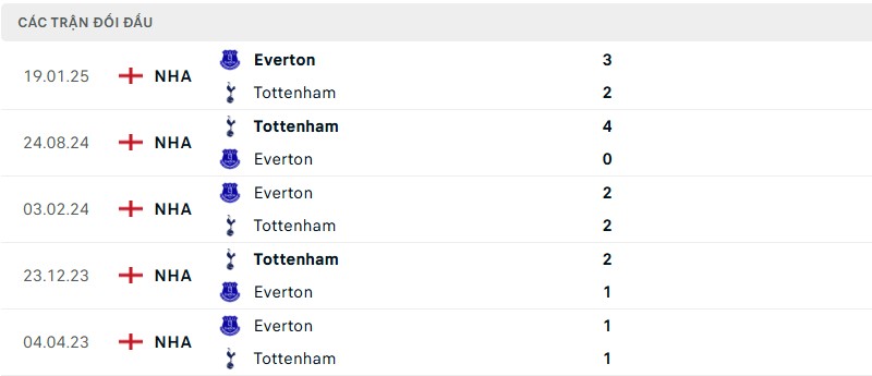 Thành tích khi hai đội chạm trán Everton vs Tottenham