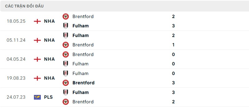Nhìn lại thành tích đối đầu, Fulham đang là đội chiếm ưu thế. Trong 5 lần gặp nhau gần nhất, Fulham thắng 3, hòa 1 và chỉ thua 1. Đáng chú ý, ở mùa trước Fulham thắng cả hai lượt trận, trong đó có chiến thắng 3-2 ngay trên sân của Brentford ở vòng 37. Trận đó, Fulham từng bị dẫn 1-2 sau khi Jimenez mở tỷ số, để rồi Mbeumo và Wissa ghi liên tiếp cho Brentford.
