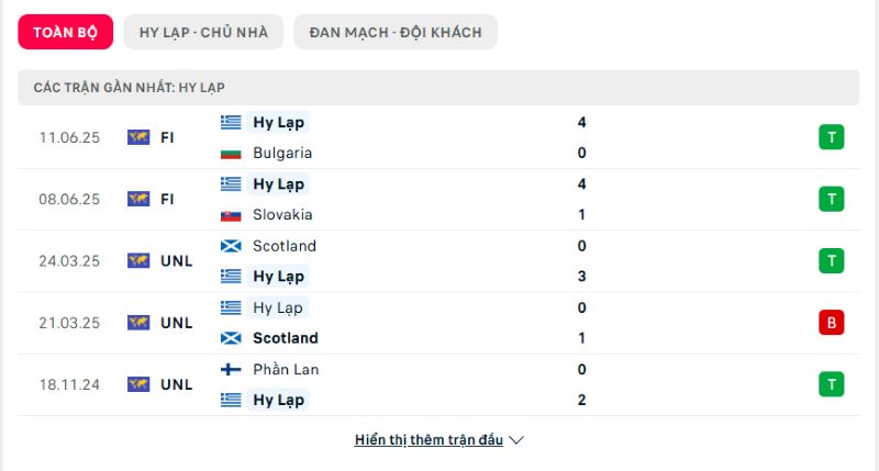 Nhận định Hy Lạp vs Đan Mạch cho thấy sự cân bằng đáng kể. Trong 5 lần gặp nhau gần nhất, Hy Lạp thắng 1 trận, Đan Mạch thắng 2 trận và hai đội hòa 2 lần. Trận đấu gần nhất giữa hai đội kết thúc với kết quả hòa 1-1.