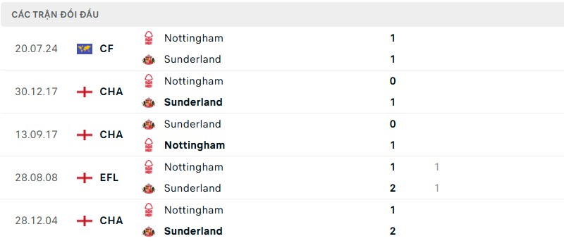 Lịch sử đối đầu giữa Nottingham vs Sunderland
