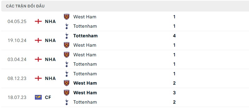 Thành tích khi hai đội chạm trán West Ham vs Tottenham