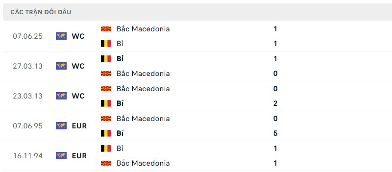 Thành tích đối đầu giữa Bỉ vs Bắc Macedonia